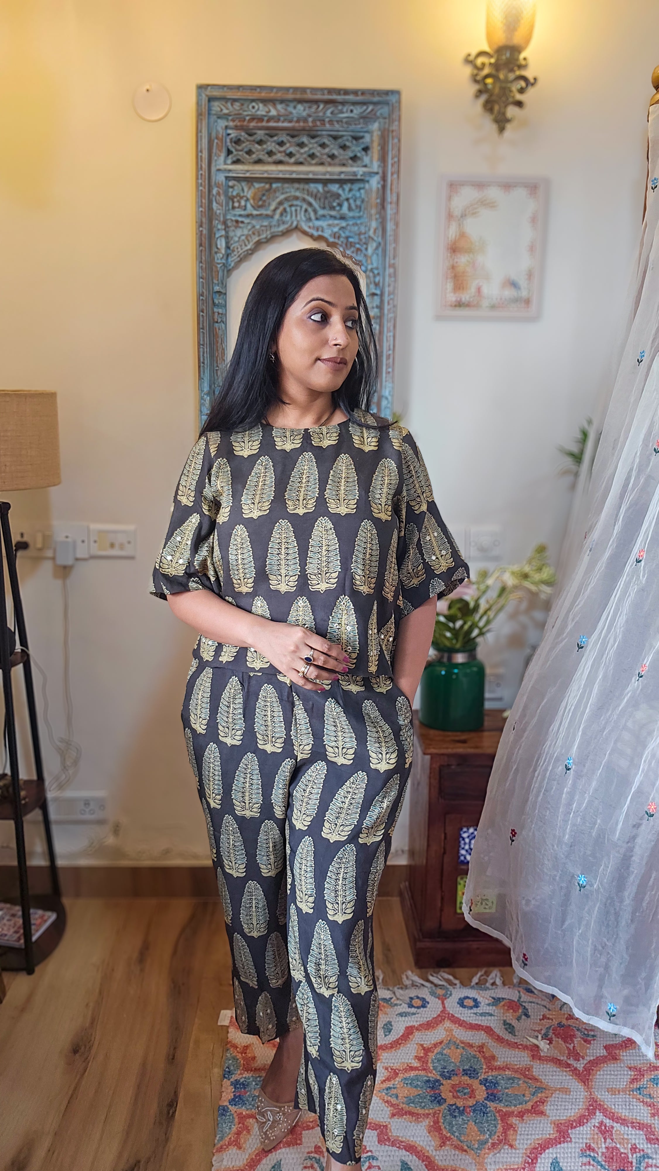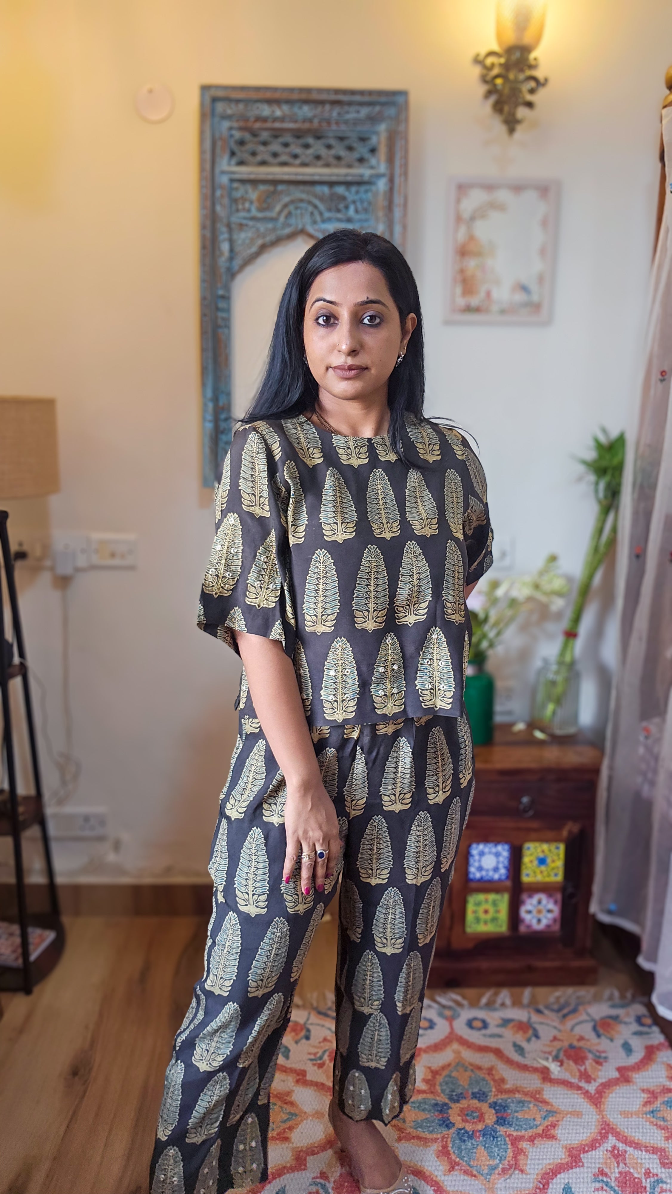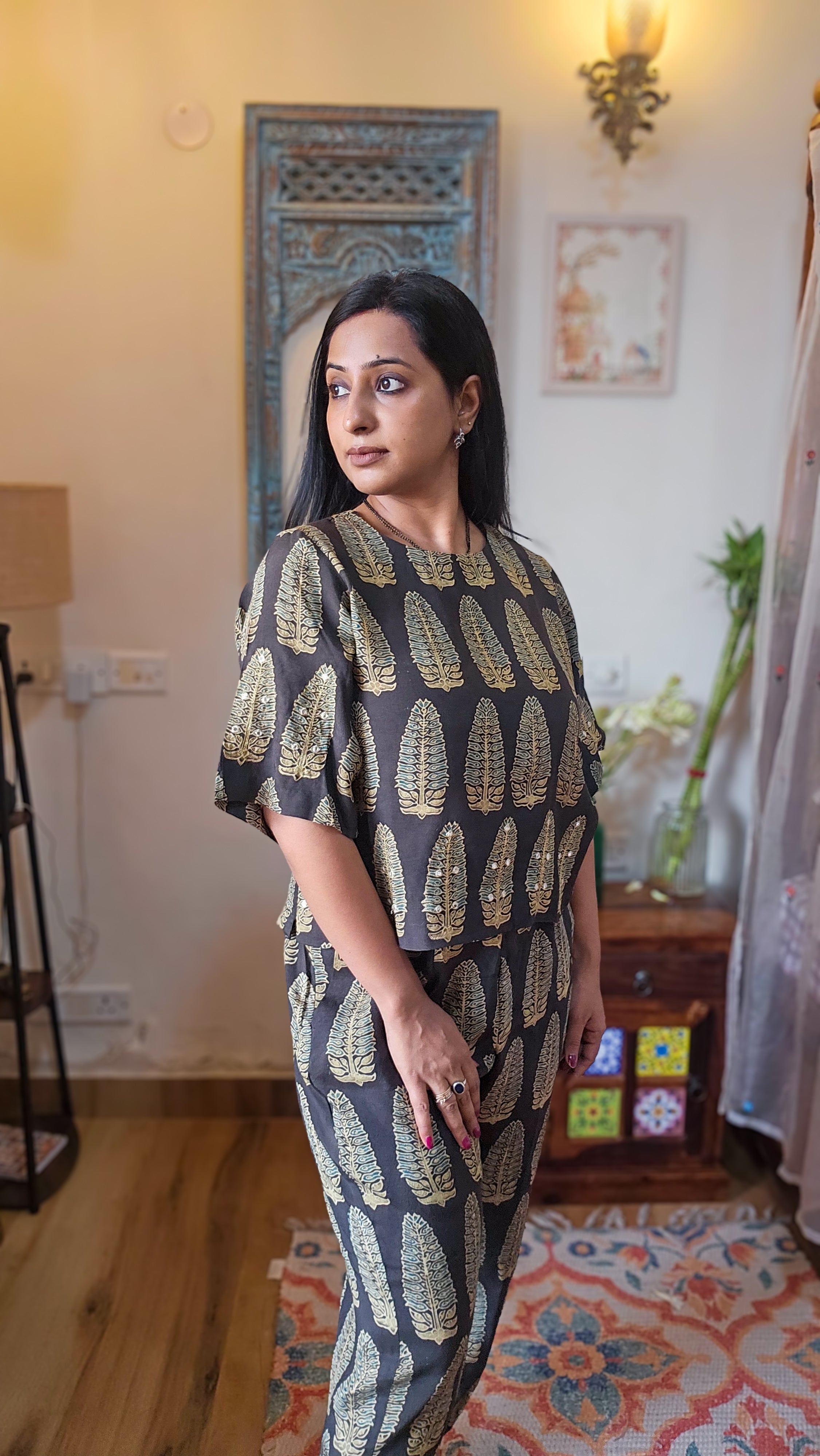 Experience elegance personified with the Ajrakh Crop Top and Pants Coordset. Made from pure cotton and naturally dyed, this set ensures comfort and breathability. Featuring exquisite detailing on the sleeves, top, and pants, it is designed to elevate your style effortlessly. A sophisticated, go-to outfit that combines traditional artistry with modern style.