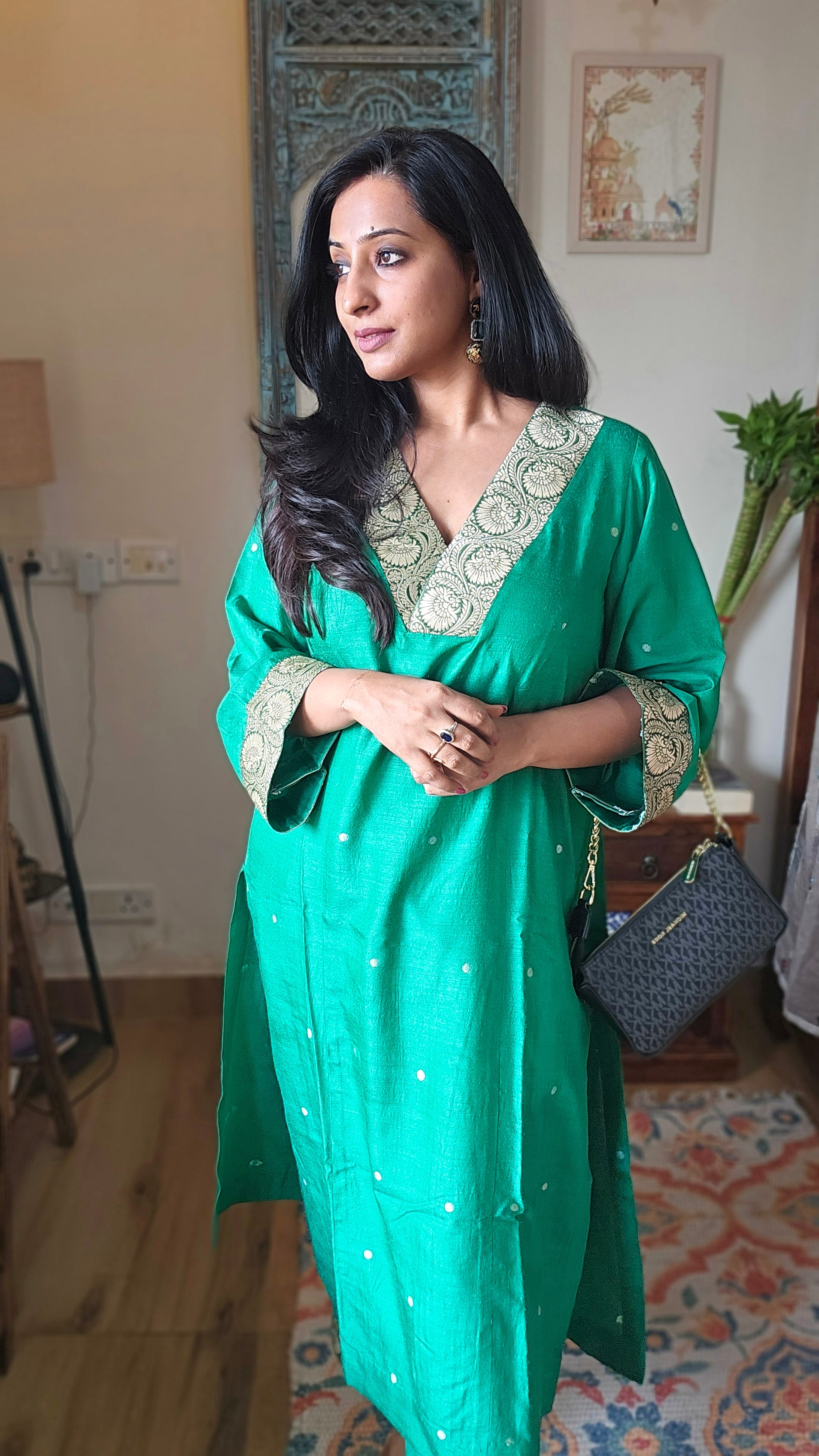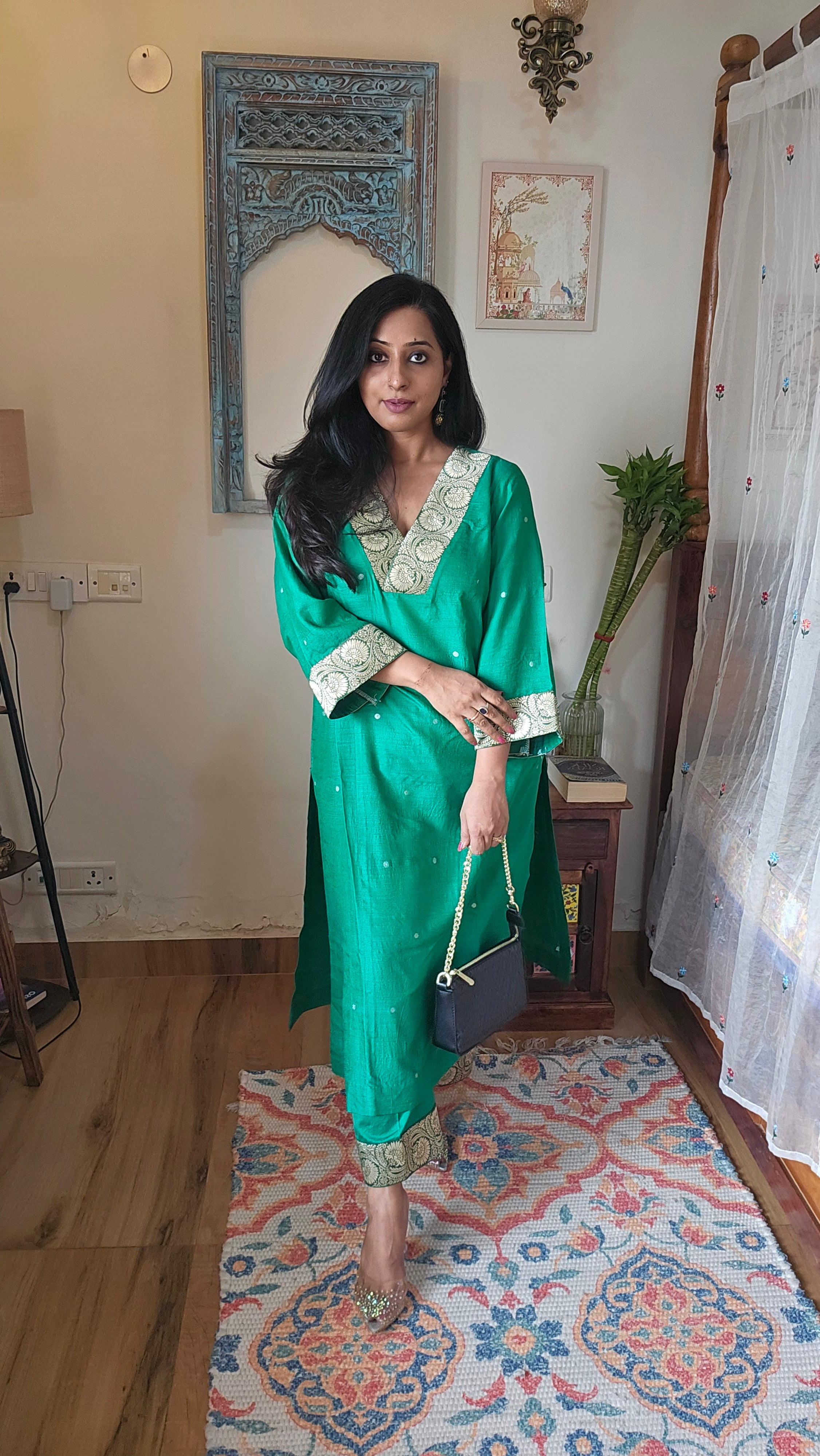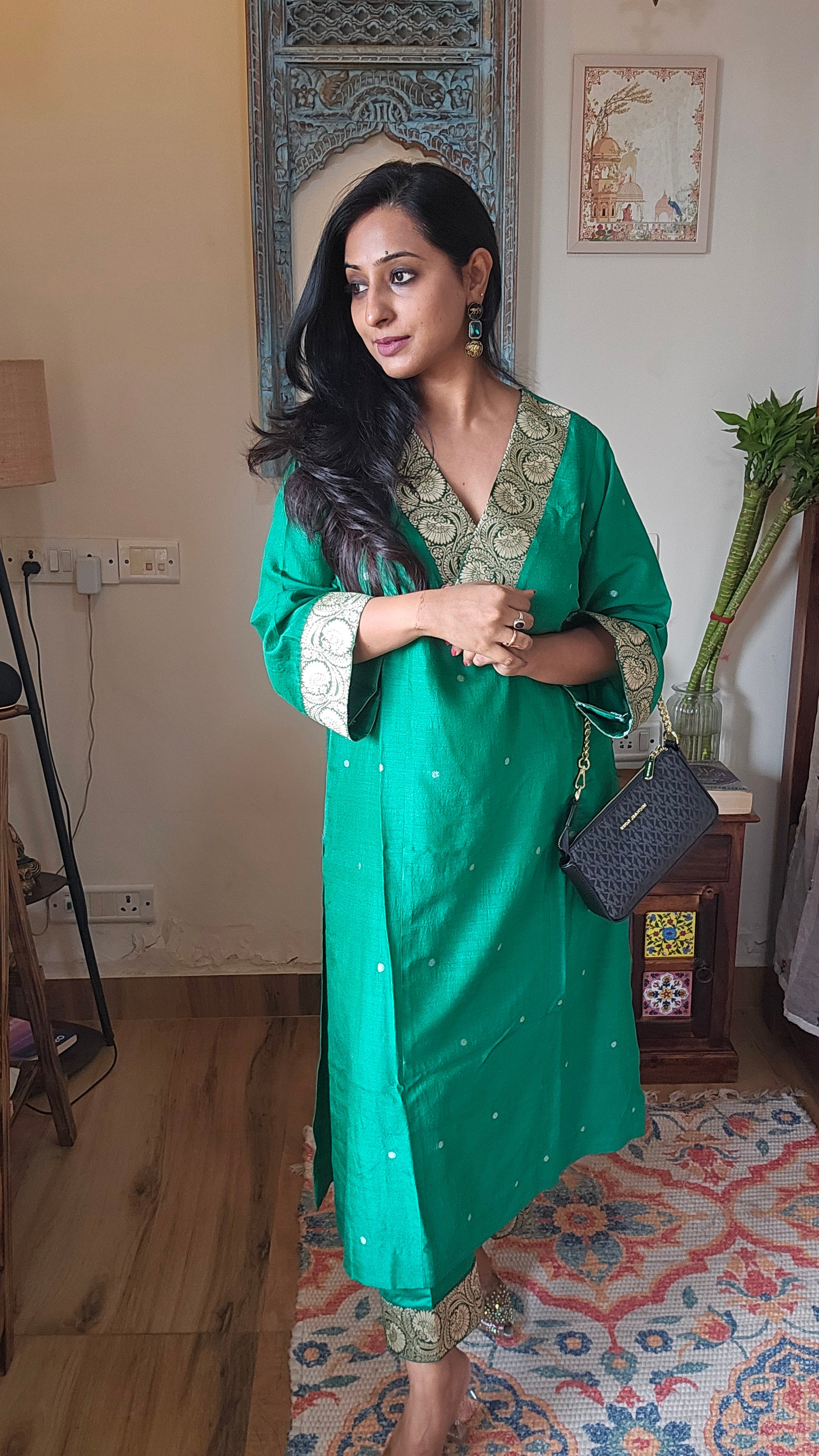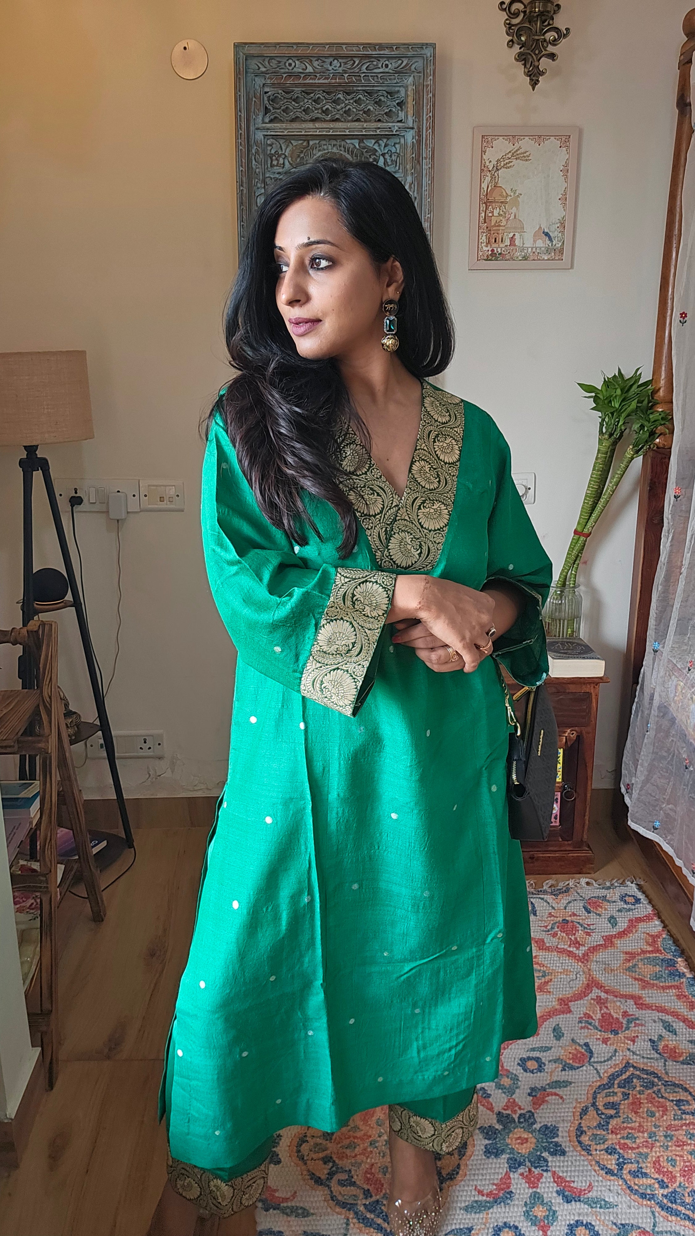 Crafted from pure handloom silk, this Green Banarasi Silk Co-ord features exquisite booti motifs and elegant brocade detailing on the neck and sleeves. Designed for effortless wear, it offers practical pockets while maintaining a refined silhouette. Perfect for festive occasions and wedding celebrations, this ensemble combines traditional artistry with modern sophistication.