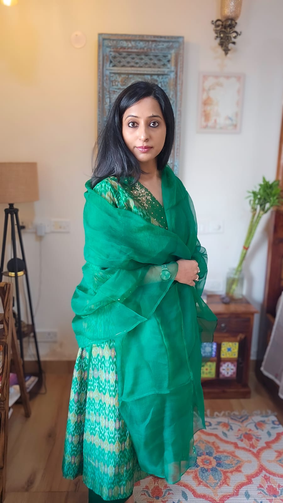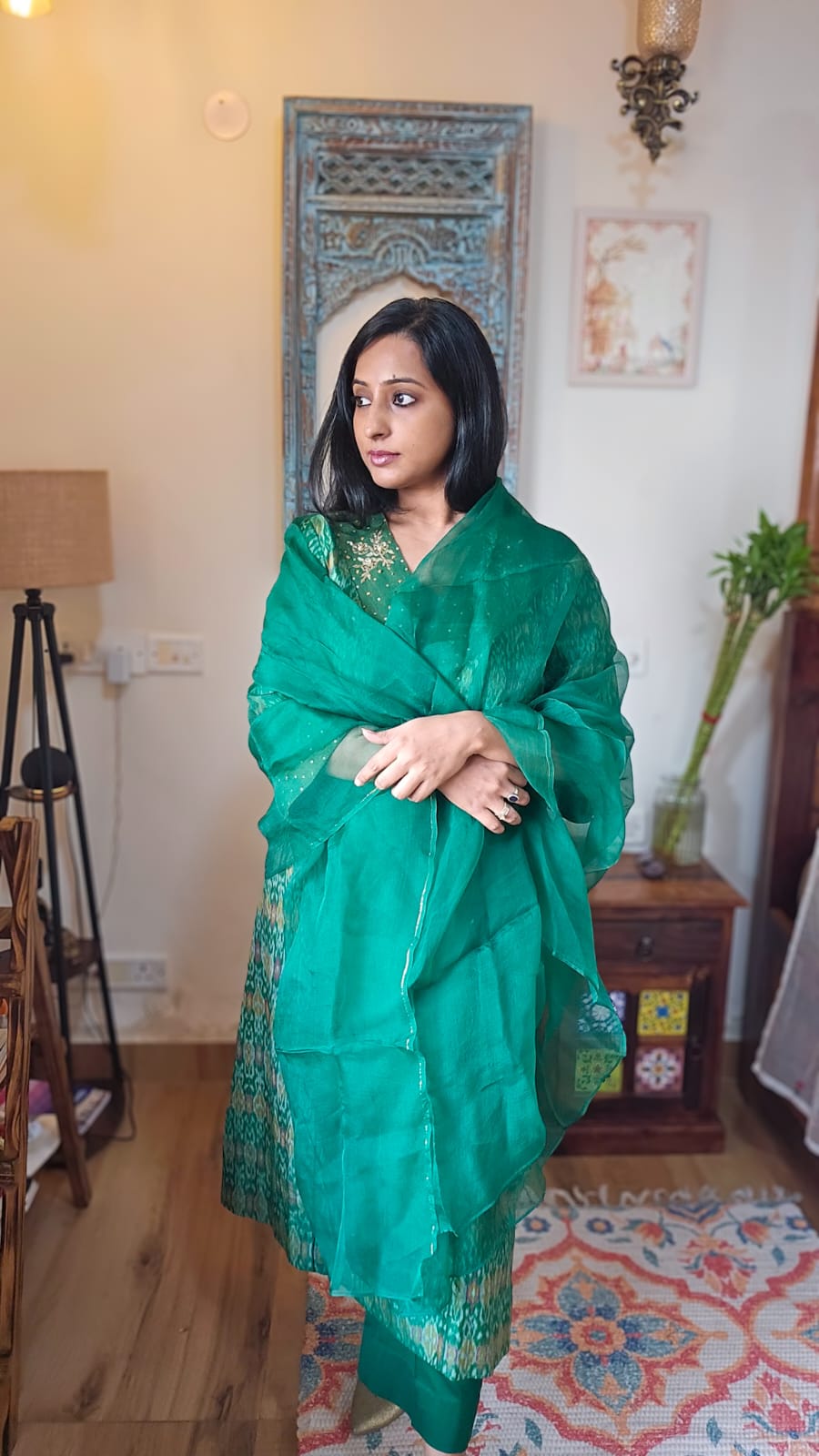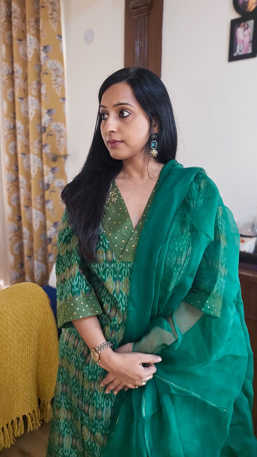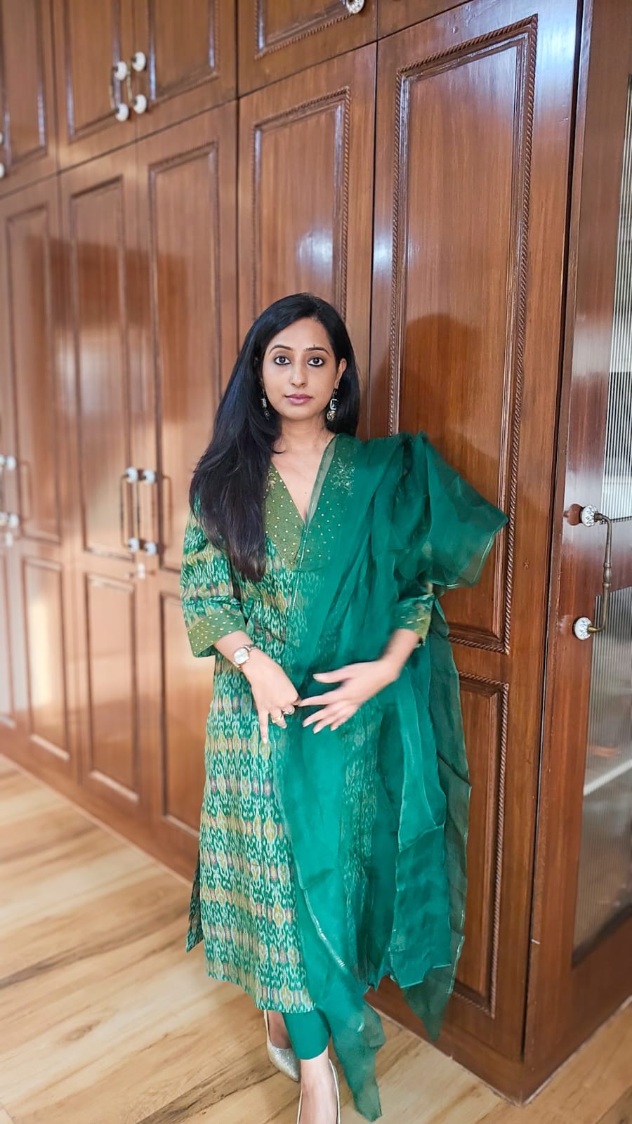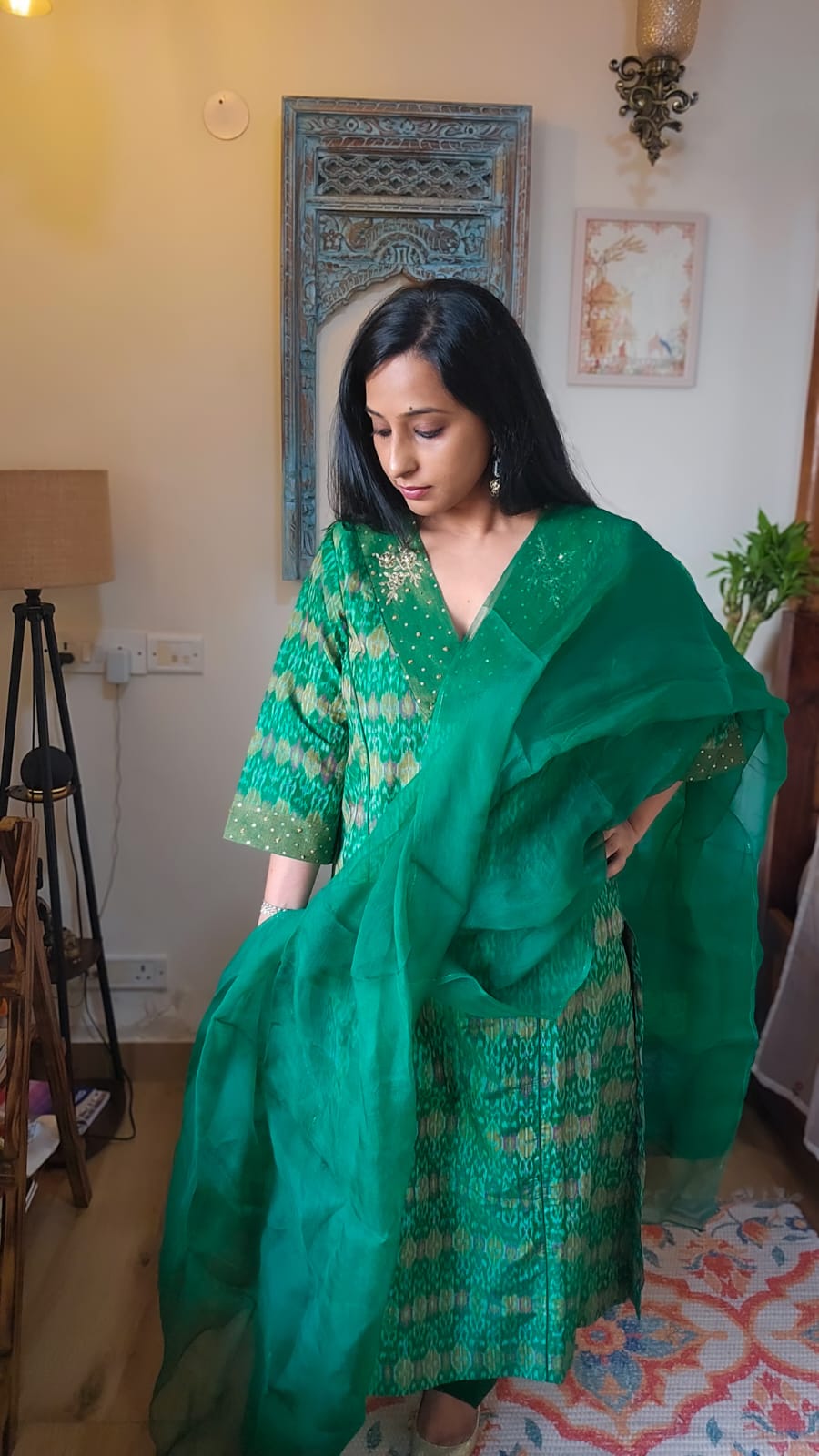 Crafted from premium cotton-silk fabric, this Green Ikkat Kurta and Pant Set features delicate handmade embroidery along the neckline and sleeves. The V-neck kurta exudes understated luxury, making it an impeccable choice for festive celebrations and pre-wedding functions. Elegance and tradition combine seamlessly in this refined ensemble.